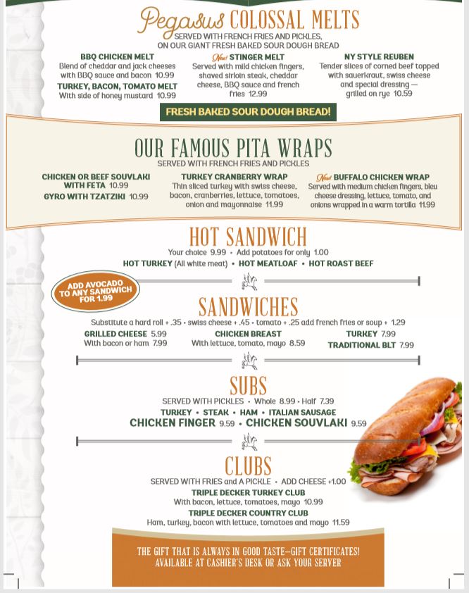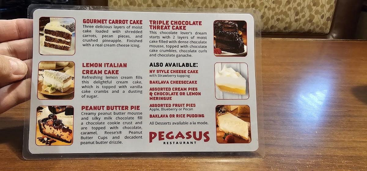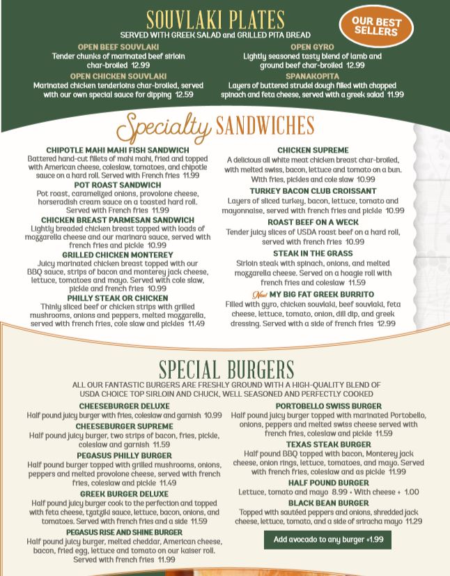Seafood lovers will rejoice with dishes like Stuffed Filet of Sole and New Orleans Haddock Filet & Shrimp. The generous portions are a highlight, alongside personalized, attentive service that makes every visit special. Patrons rave about the Greek Combo Dinner and Baklava Cheesecake, further enhancing Pegasus's reputation for memorable meals. With a family-friendly atmosphere and excellent parking availability, Pegasus Restaurant is truly a destination for all your culinary cravings.